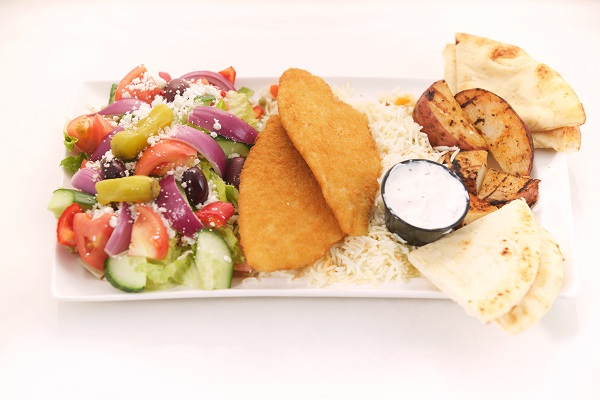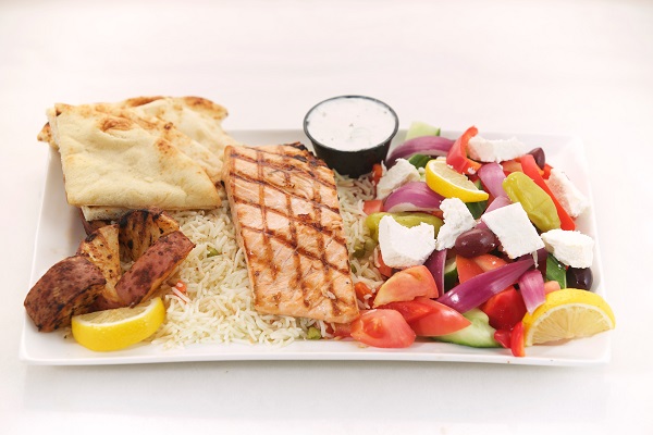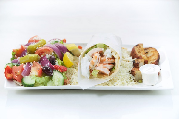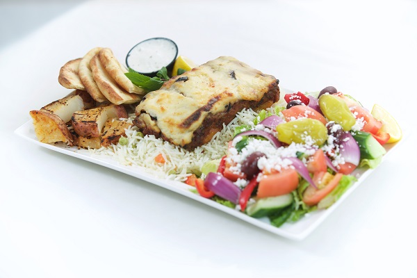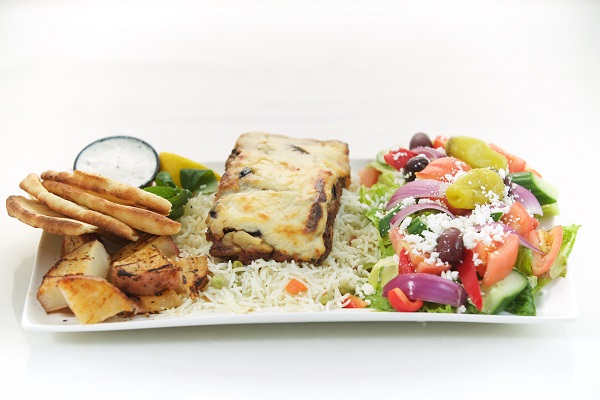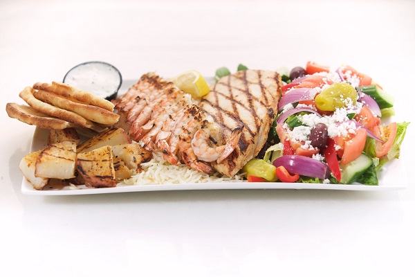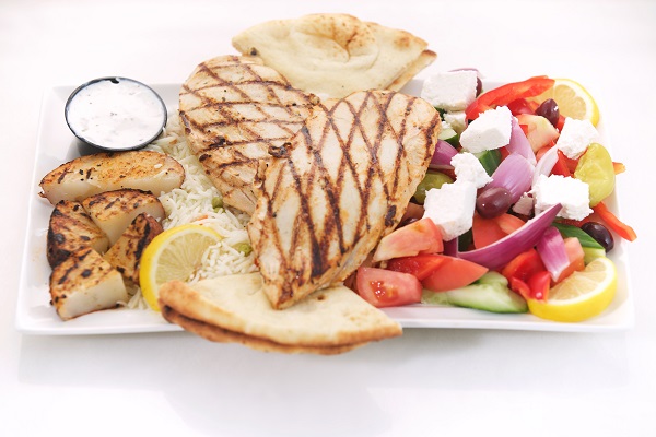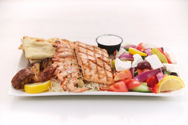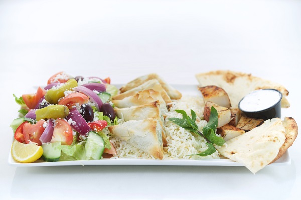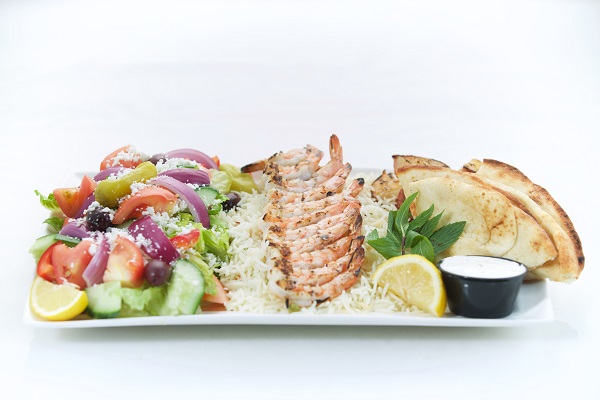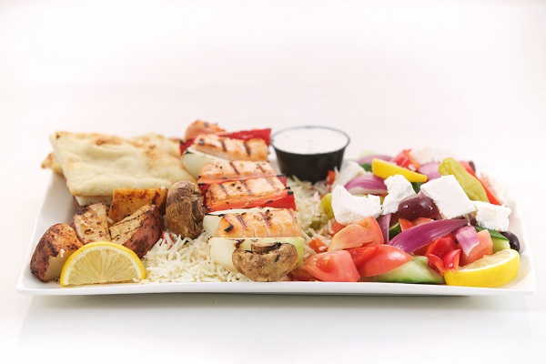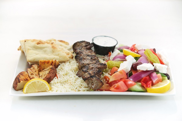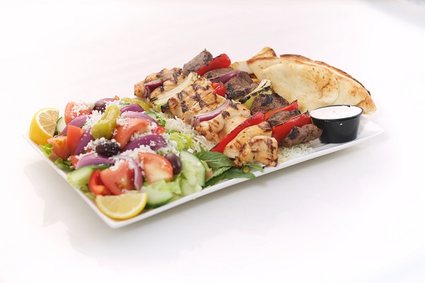 One Skewer of chicken or pork, a salad of your choice, rice pilaf, roasted potatoes, tzatziki dip and pita bread & Baklava for lamb