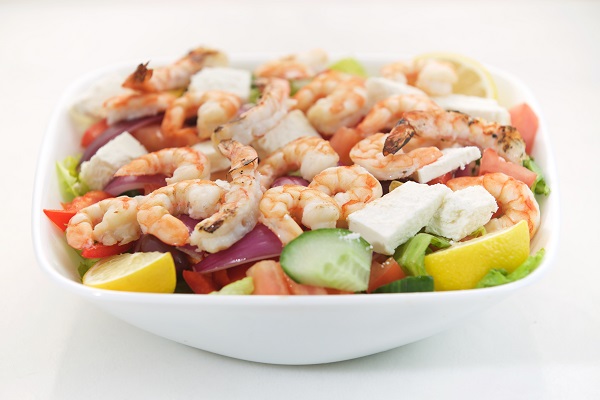 Our famous Greek salad with shrimp on top